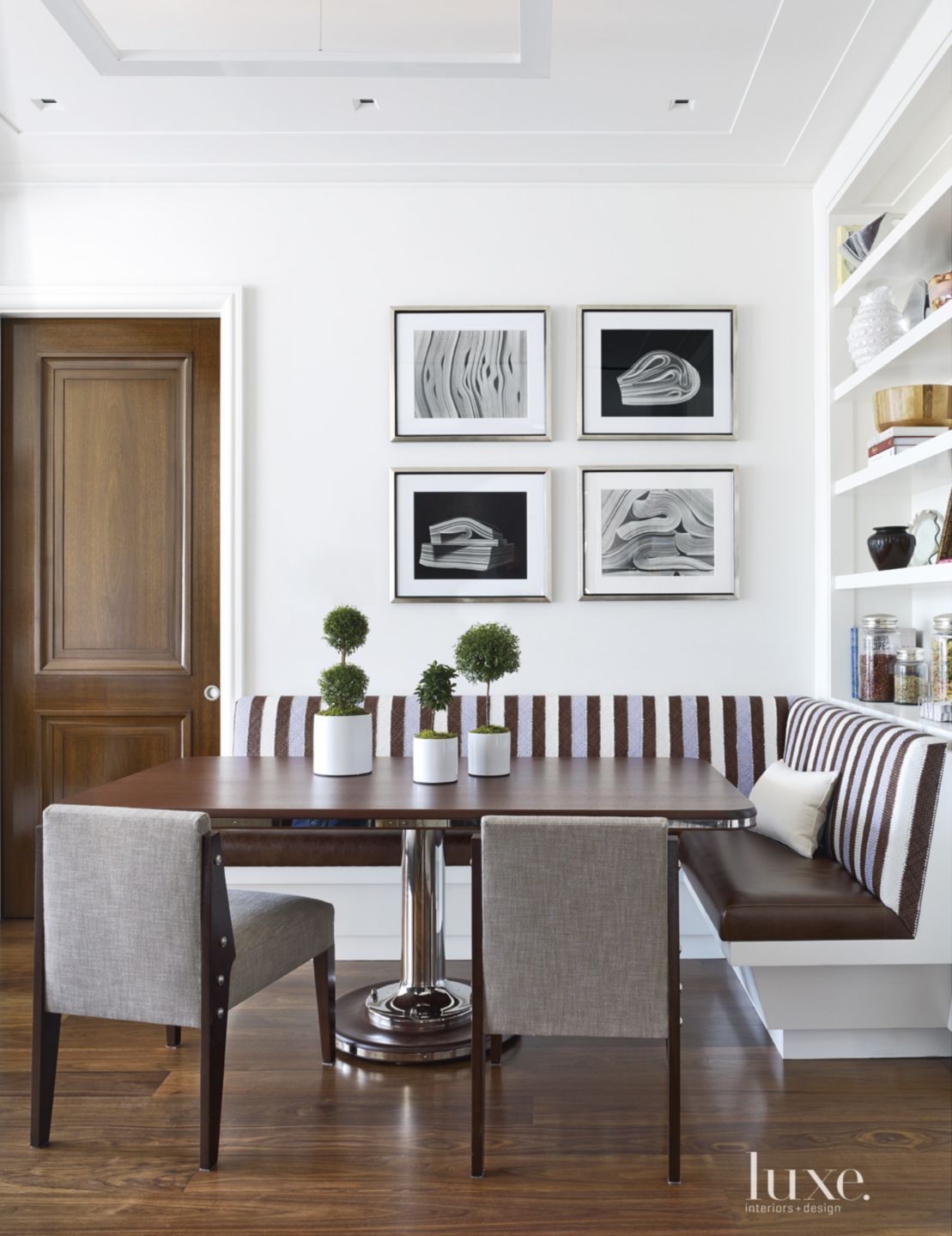 - Белый кухонный уголок с двумя диванами, стоящими напротив друг друга