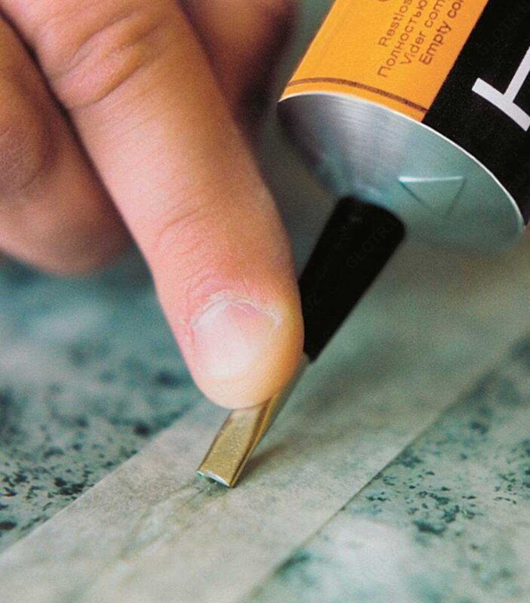 Основная задача – склеить линолеум незаметно. В связи со способностью клея действовать в форме растворителя, следует позаботиться о защите собственных рук и поверхности обрабатываемого материала. Резиновые перчатки решат проблему собственной безопасности, для линолеума подготовьте односторонний малярный скотч. Наклеить его можно отдельно на каждую часть покрытия или посередине шва с последующим разрезанием.