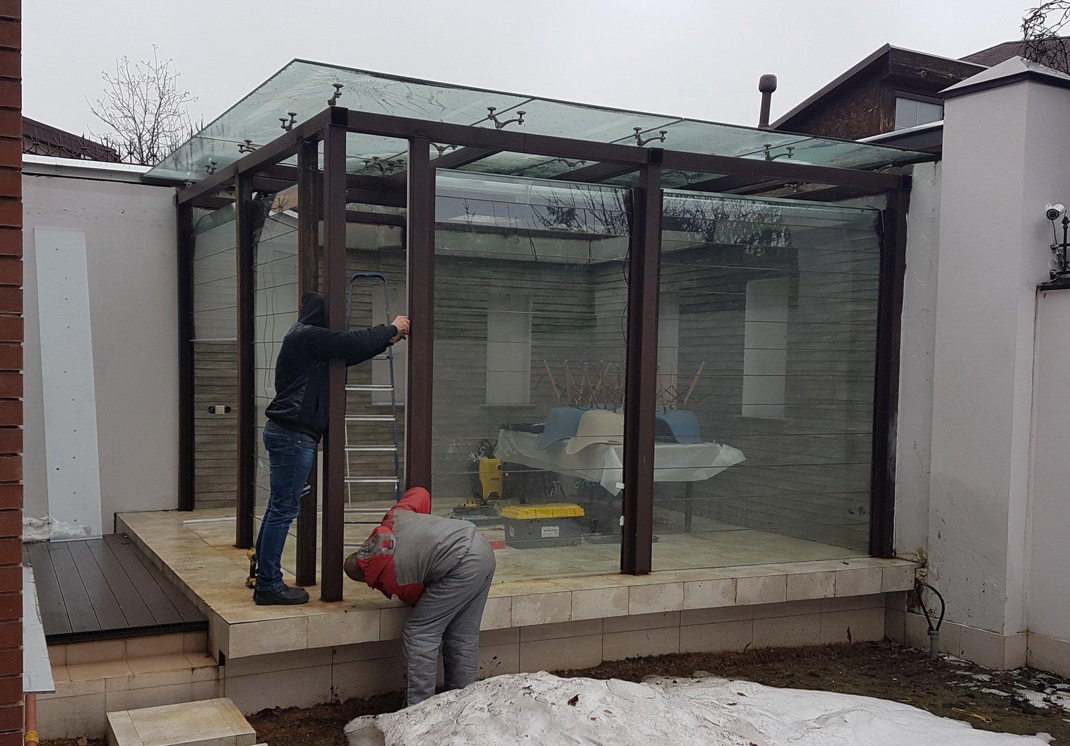 При возведении такой веранды несущие каркасные конструкции обычно выполняют из стального или алюминиевого проката: круглых или прямоугольных труб, швеллеров, уголков, а остекление крыши и стен — из листового поликарбоната толщиной от 8 до 16 мм, органического или из обычного силикатного стекла. Уклон крыши, как правило, предусматривает не менее 30°, чтобы снег мог самостоятельно спускаться с ее скатов.